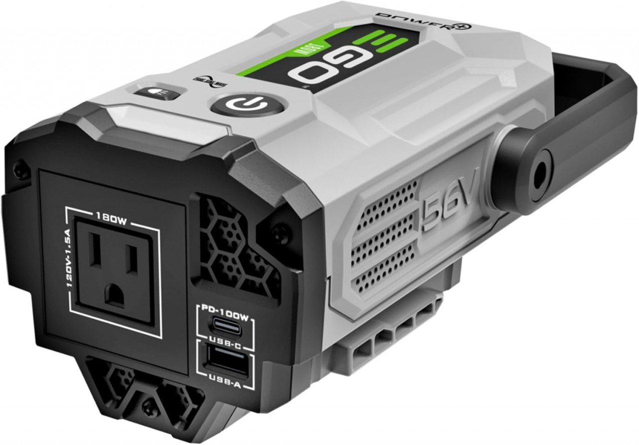 The EGO POWER+ Nexus Escape 180W Inverter with pure sine wave delivers high-quality, clean power to sensitive electronics. The inverter provides 180 watts of continuous power via its standard 120V power outlet. Power devices from phones to laptops via its 100W USB-C PD port. Other devices can be powered via the USB-A port. An integrated LED spotlight provides ambient lighting during a power outage and other low light situations. A built-in carrying handle allows for easy transport. The 180W inverter is compatible with all EGO 56V ARC Lithium™ batteries (available separately). With the EGO POWER+ Nexus Escape 180W Inverter, you’ll have portable power when you want it, power when you need it.