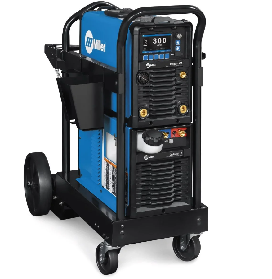 What do you get when you combine the Miller Dynasty 300 TIG Welder with CPS with Miller’s Coolmate 1.3 and Miller Running Gear? You guess it. The Miller Dynasty 300 TIG Runner Package with CPS. This power packed machine offers full AC features, including advanced waveforms and wide range of balance and frequency. The 300 is a powerful combination of capability and portability. Welding up to 3/8 inch material, the AC/DC TIG and Stick power source is a powerful, energy efficient inverter.